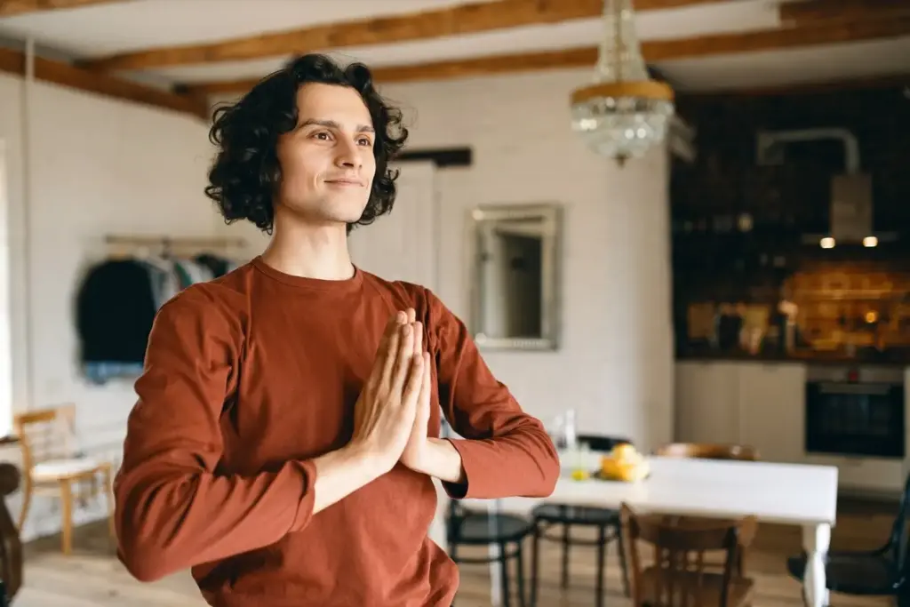 Place one hand on your abdomen and one on your chest. Inhale gently through your nose for four, let the belly expand, then exhale for six with a soft sigh. Notice shoulders dropping, jaw unclenching, vision widening. Repeat once or twice to mark a fresh beginning.